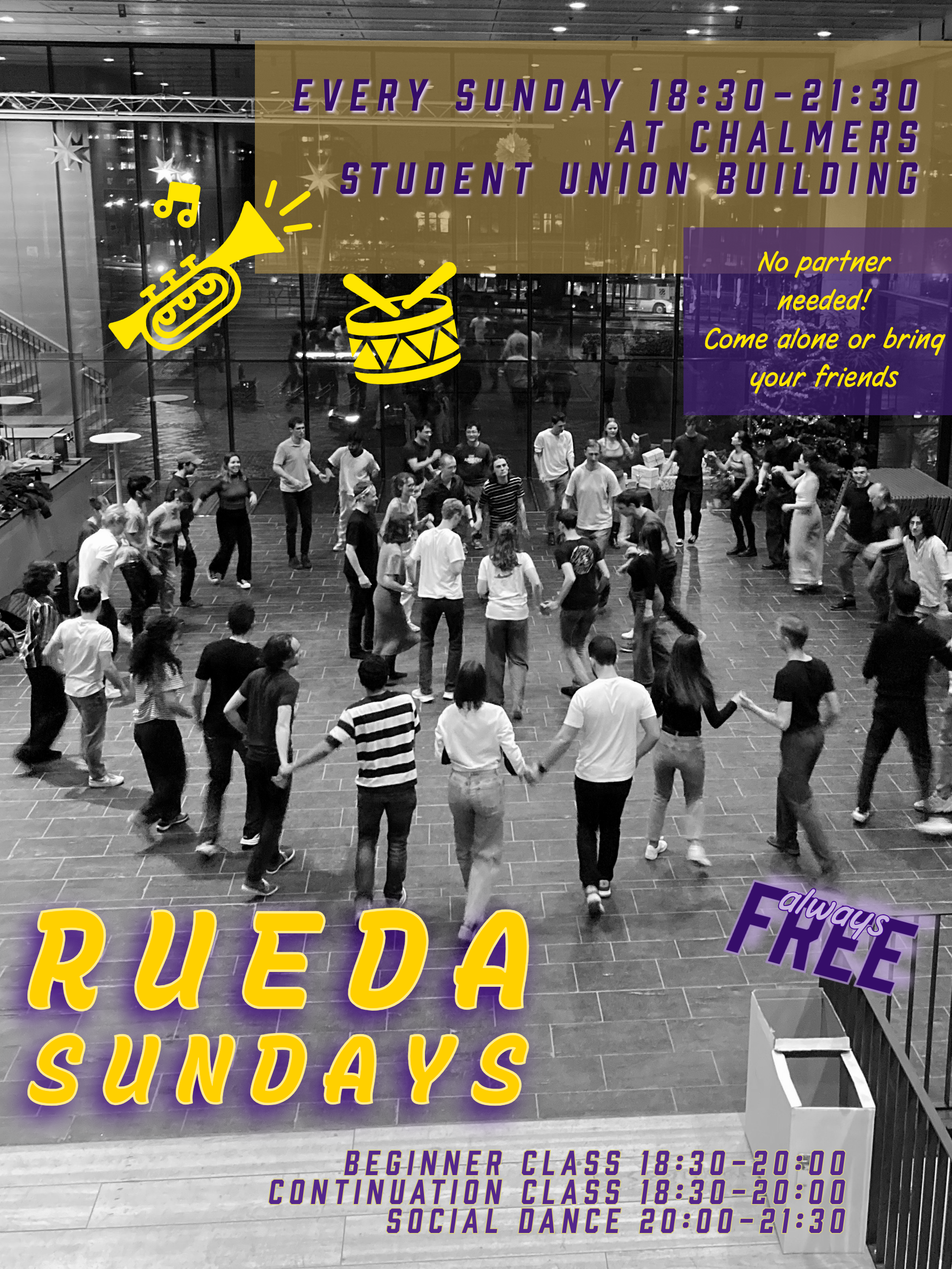 Every Friday we meet in Chalmers Union Building, right in front of J.A Pripps. We have an open playlist, which naturally and generally turns a bit chaotic, which is why we lovingly refer to our Fridays as “Chaos Fridays”. We frequently see dances such as Bugg, West Coast Swing, Salsa, Bachata, Lindy Hop, Argentine Tango, and Ballroom dances in our hangouts. Sometimes we have even seen Burlesque dancing and Bollywood dancing – you never know what might show up! Feel free to bring your own dance: we are many that are eager to see and try out new things!